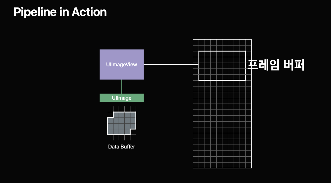 마지막으로 UIKit가 UIImageView를 Rendering하도록 요청하면 Image Buffer안에 저장되어 있는 이미지 데이터(색상과 투명도)를 Frame Buffer에 복사하고 크기를 조정합니다.
