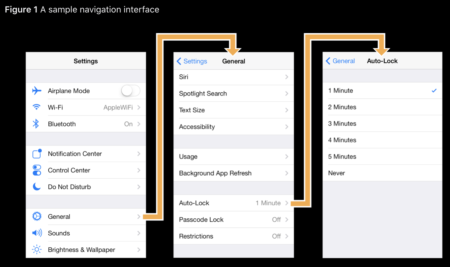 Navigation Interface를 사용하여 앱에서 관리하는 계층적 데이터 구성을 모방합니다. 계층 구조의 각 수준에서 해당 수준의 콘텐츠를 표시할 적절한 화면(Custom ViewController에서 관리)을 제공합니다. 그림 1은 iOS 시뮬레이터의 설정App 에서 제공하는 Navigation Interface의 예를 보여줍니다. 첫 번째 화면에는 기본 설정이 포함된 App 목록이 표시됩니다. 응용 프로그램을 선택하면 해당 응용 프로그램에 대한 개별 설정 및 설정 그룹이 표시됩니다. 그룹을 선택하면 더 많은 설정 등이 생성됩니다. Root View를 제외한 모든 Item에 대해 Navigation Controller는 사용자가 계층 구조 위로 다시 이동할 수 있도록 BackButton을 제공합니다.