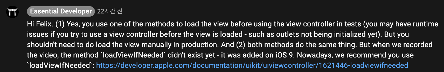 (1) 테스트에서 ViewController를 테스트할 때, viewDidLoad가 호출되게 하기 위해서 사용한다고 말씀해주셨습니다. 하지만 테스트가 아닌 일반적인 환경에서는 굳이 view를 수동으로 로드할 필요가 없다고 합니다!