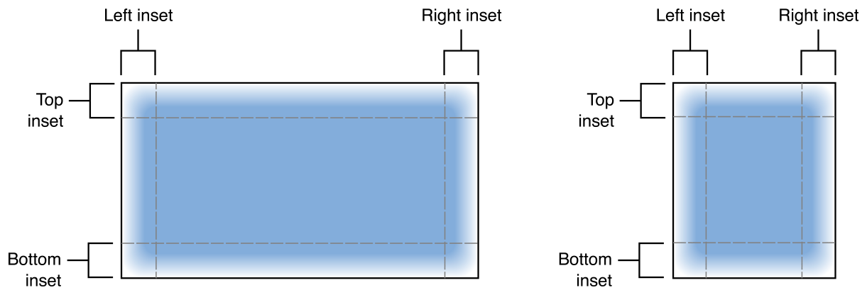 resizableImage(withCapInsets:) 또는 resizableImage(withCapInsets: resizingMode:) 메소드를 사용해 기본 이미지에 인셋을 추가하여 Stretchable Image를 정의할 수 있습니다. insets은 이미지를 둘 이상의 부분으로 세분화합니다. 각 inset에 0이 아닌 값을 지정하면 이미지가 9개 부분으로 나뉜다.