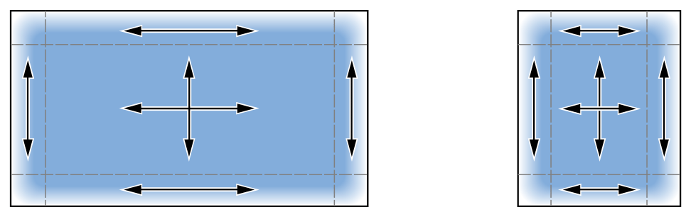 각 inset은 지정된 치수로 늘어나지 않는 이미지의 부분을 정의합니다. 영상의 상단 및 하단 inset의 영역은 고정 높이를 유지하고, 왼쪽 및 오른쪽 삽입 내부의 영역은 고정 너비를 유지합니다. 아래 그림은 사용 가능한 공간을 채우기 위해 이미지 자체가 늘어남에 따라 9개 부분 이미지의 각 부분이 늘어나는 방식을 보여줍니다. 이미지의 모서리는 수평 및 수직 삽입 내부에 있으므로 크기가 변경되지 않습니다.